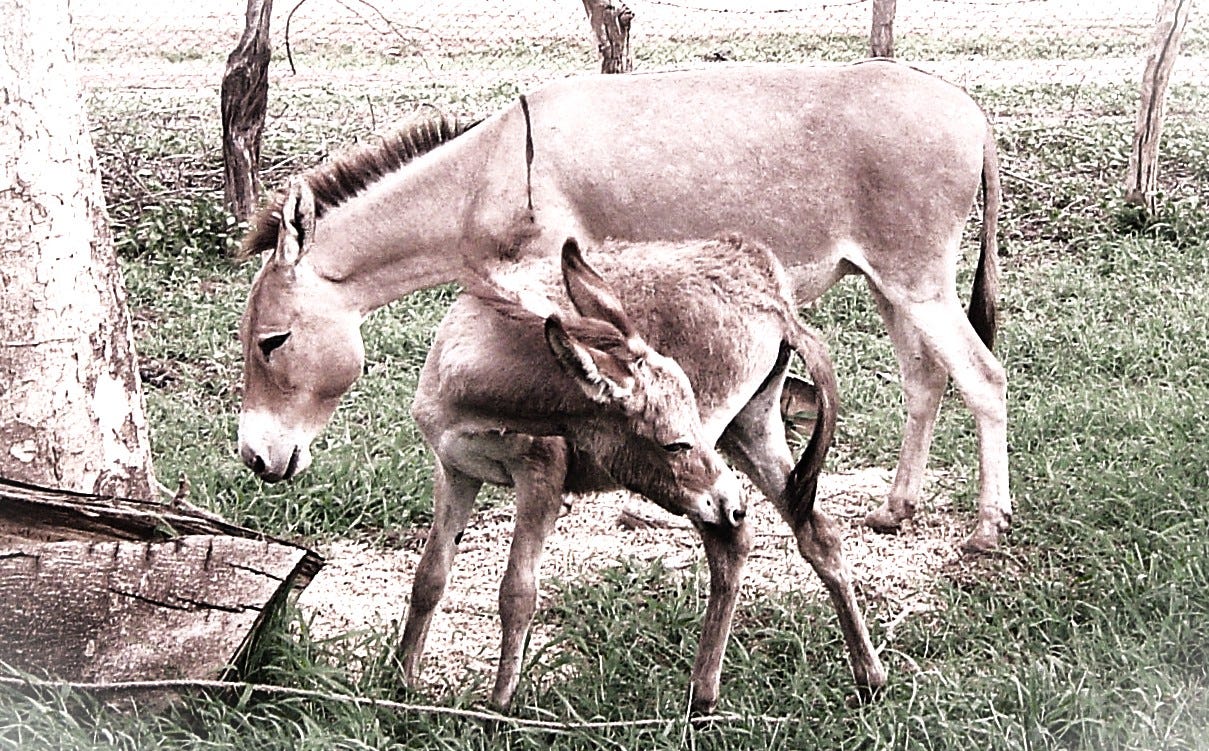 The soundbox stopped. They sat in quiet for a little time. She heard clattering as the air stirred spent factories around the earth floor and single thuds as mature confections snapped the slender green threads suspending them from the living plants and plummeted to earth. Another series of heavy thuds made her turn around again. This four-legged creature had a grey-brown skin with a stiff line of darker coarse hair along the back of its neck and faint lines on its back and hindquarters. Its elongated head was topped by large, long ears that stretched upward.